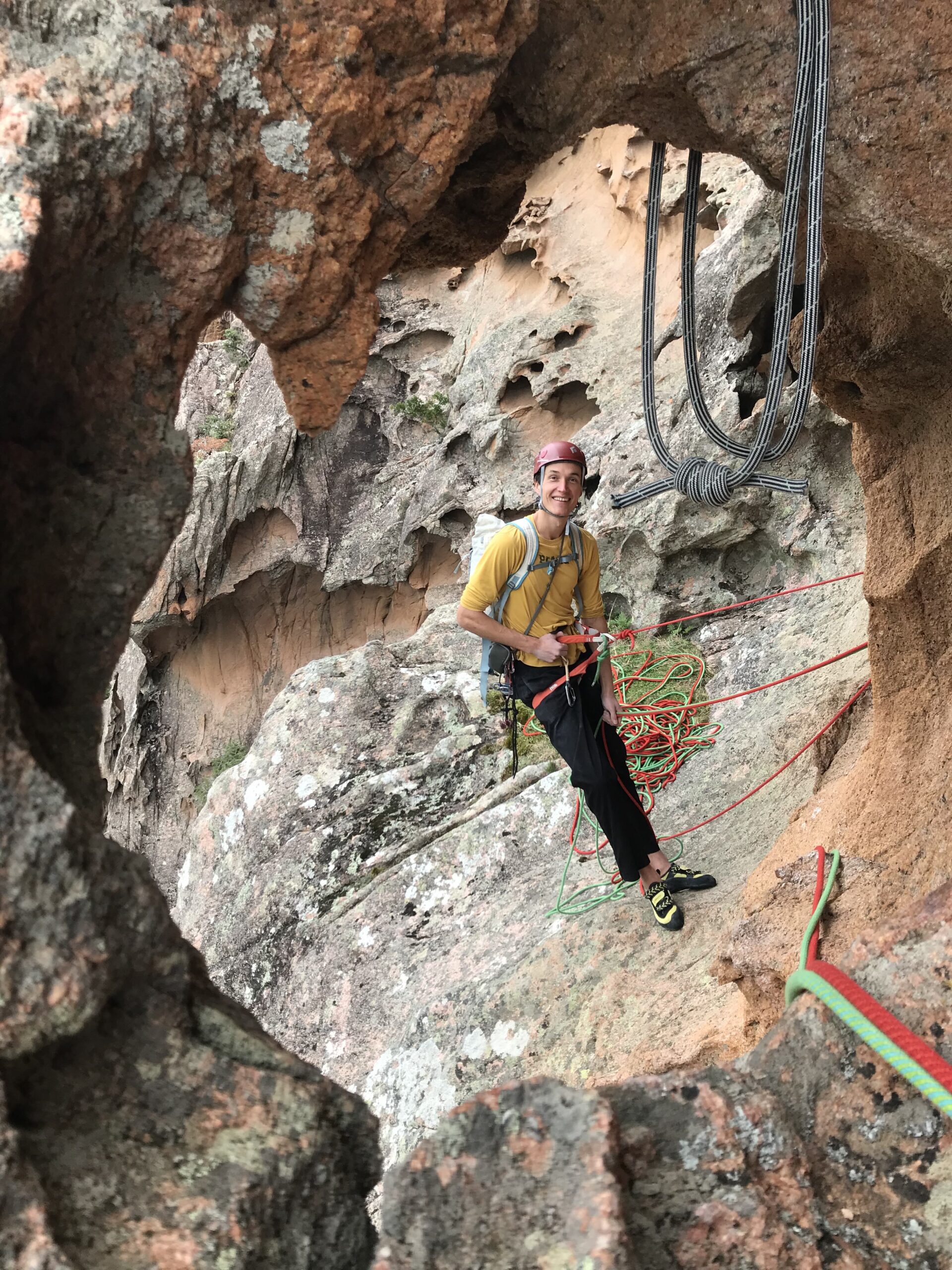 In der Dritten, einer 7c, geht es gleich nach dem Stand zur Sache. Mit kaum Tritten, kann man nur dem Gummi vertrauen und eine fragil wirkende Schuppe durchdrücken, um zum guten Riss zu kommen. Bleibt zu hoffen, dass sich die nie verabschiedet. In der Rissverschneidung muss man dann noch einmal gut anpressen, bevor einen ein ausgesetzter Mantel zum nächsten Standplatz in einer riesigen Tafoni Höhle bringt. Optimismus auch für diese Länge.