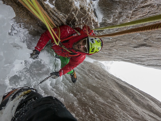Timo argumentiert sehr gut und so stolpern wir bereits um ein Uhr über den schuttbedeckten Gletscher Richtung Col Standhardt. Der Dunkelheit zum Trotz finden wir einen guten Weg durch das Gletscher- und Spalten-Labyrinth. Bei Sonnenaufgang befinden wir uns circa auf Höhe des Bergschrundes, dieser ist leicht zu überwinden. Es folgt die Schnee-Eisrinne zum Col hinauf. Oben am Col weht der Wind sehr stark und unablässig. Nach zwei Seillängen mit mehreren kleinen Plendlern, die Timo zügig vorsteigt, sind wir erstmal weg vom Wind. Wir befinden uns auf der Lee Seite. Es ist angenehm windstill im Vergleich zum Col. Es folgen ein paar nicht zu schwere Längen durch Fels und Schnee und schon stehen wir am Anfang des imposanten Eiskamins, dem Markenzeichen der Exocet. Ohne Probleme führt Timo durch die Längen des Eiskamins immer darauf bedacht, so wenig wie möglich Eisschlag auszulösen. Jeder einzelne Eisbrocken würde mich wohl oder übel treffen. Die Kletterei ist anspruchsvoll, die Spindrifts sehr unangenehm. Zumindest bleiben uns die Gefahren der Tageserwärmung erspart, da es bewölkt ist. Irgendwann am Nachmittag erreichen wir die Scharte am Ende des Eisschlauches. Dort erwartet uns eine sehr anspruchsvolle, ungute Seillänge. Wieder einmal klettert Timo durch das schwierige Gelände. Ich ziehe mich so schnell wie möglich und mit allen Hilfsmitteln nach oben. Plötzlich befinden wir uns auf dem Gipfelschneefeld, es sind nur noch circa 100 Meter nach links zum Gipfel Mushroom aus Eis und Schnee.