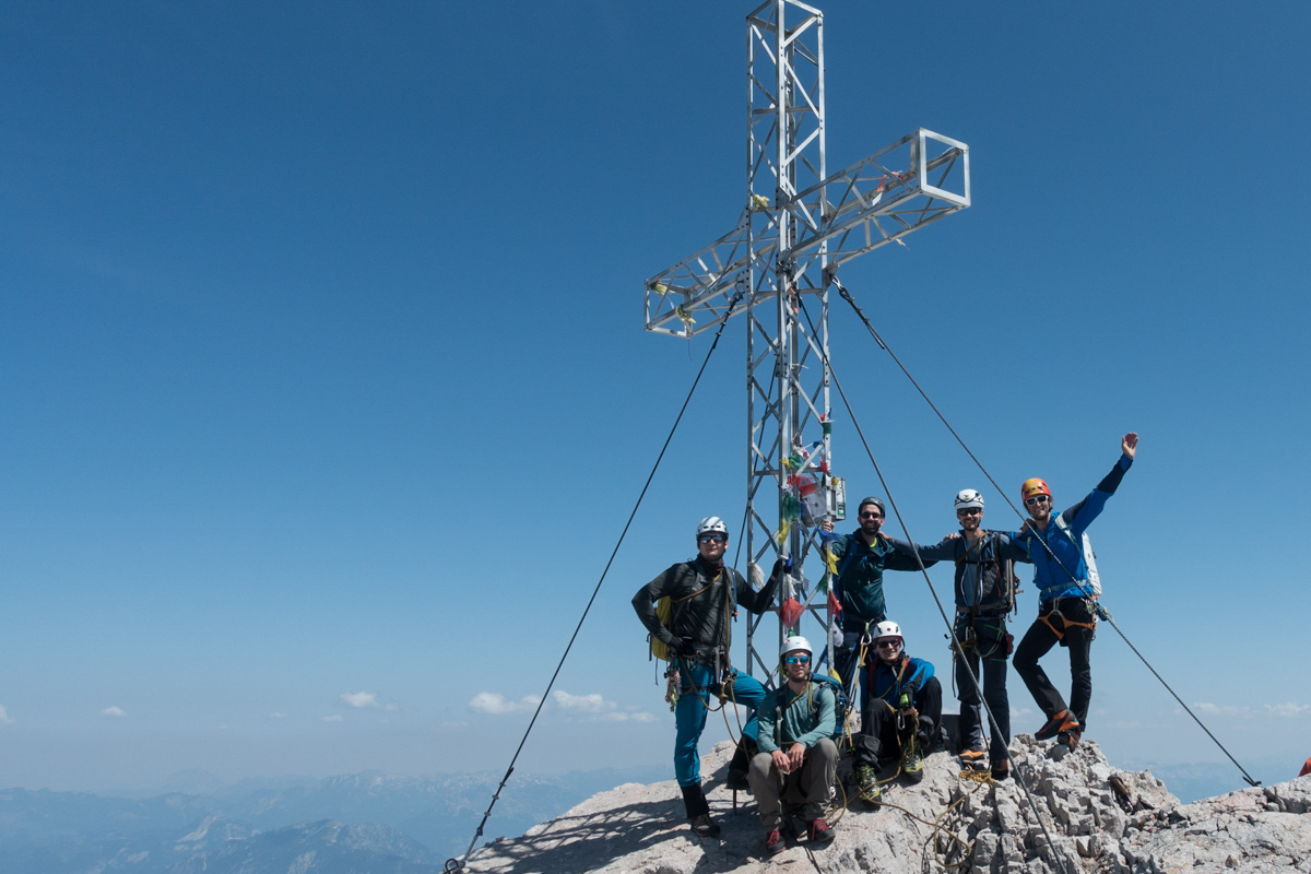 Oben angekommen nehmen wir uns die Zeit für die wohl verdiente Gipfelrast. Steile Ausblicke über die Abbrüche der Südwand auf der einen Seite, der Gosau Gletscher und Hallstätter Gletscher auf der anderen, machen den Dachsteingipfel zu einem besonderen Ort. An klaren Tagen reicht die Aussicht über die Berggipfel Österreichs hinweg bis nach Tschechien und Slowenien.