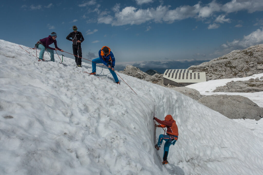 Rau und grau ist es, das ewige Eis. Bedingt durch die Klimaerwärmung wird es Jahr für Jahr weiter zurückgedrängt, im Sommer kommt es in hohen Lagen trotzdem vielerorts zum Vorschein. Wer sich auf dem steilen Buckel eines Gletschers sicher fortbewegen will, greift zu spitzen Gegenständen: Steigeisen an den Füßen, Pickel in der dem Hang zugewandten Hand. Der Bergführer zeigt uns, wie man die Krallen, nachdem man sie vorschriftsgemäß an den steigeisenfesten Schuhen befestigt hat, richtig ins Eis schlägt, um nicht abzurutschen und wie man mittels Eisschraube oder Sanduhr am Gletscher ordnungsgemäß sichert. Zum Abschluss der Einheit dürfen wir sogar noch mehr als einen Tiefblick in den eisblauen Riesen am Dachstein werfen. Mit der neu erlernten Technik schauen wir uns den Gletscher, der sich für uns ein Stück geöffnet hat, von Innen an. Beeindruckend!